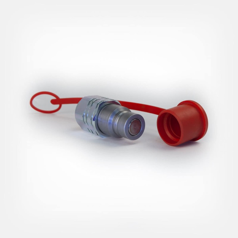 Bouchon en plastique rouge pour Coupleur mâle face plate (anti-pollution) ¼. Capuchon recouvre une partie du Coupleur mâle et assure la protection mécanique et la propreté de la face avant du Coupleur.